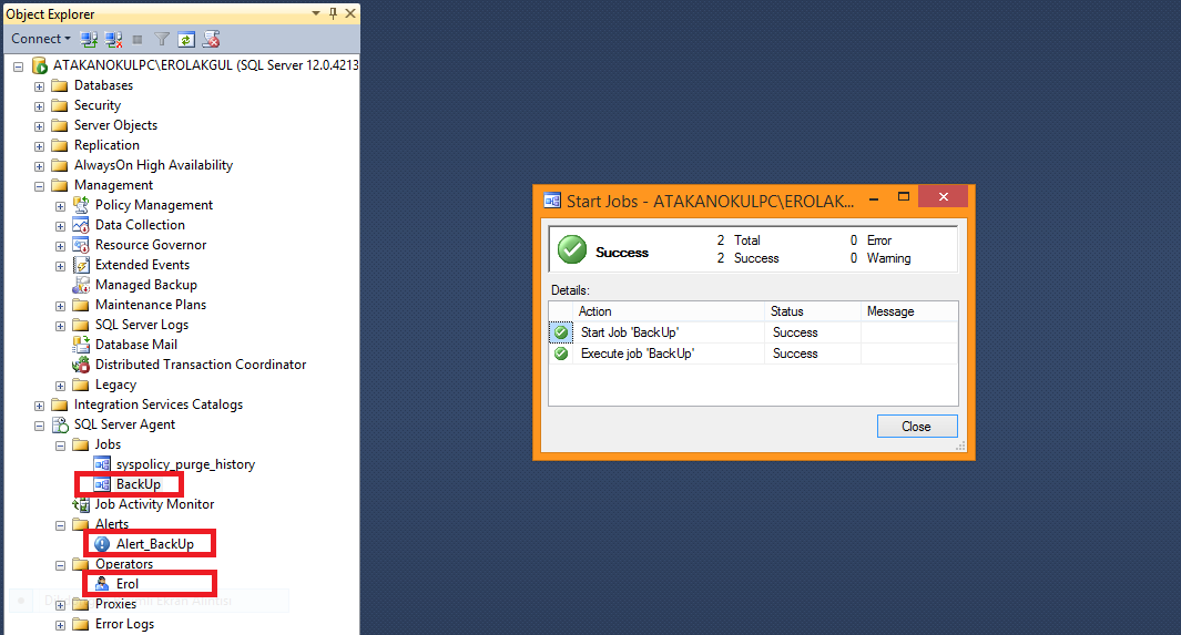 Jobs ların altında oluşturduğumuz BackUp isimli job a sağ tıklayıp Start job yapıyoruz ve Succeded larımızı alıyoruz.Yalnız Start demeden önce Configuration Manager da Sql Server Agent ı start etmeniz ve başlatma seçeneğini Otomatik olarak işaretlemeniz gerekmektedir.