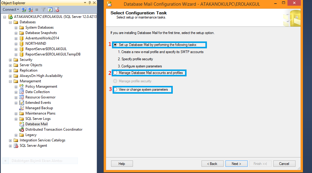 İlk defa oluşturacağımız için 1.kısım olan Set up Database Mail by Performig the following task ı seçiyoruz ve o sihirli sözcüğü tıklıyoruz –> NEXT ;