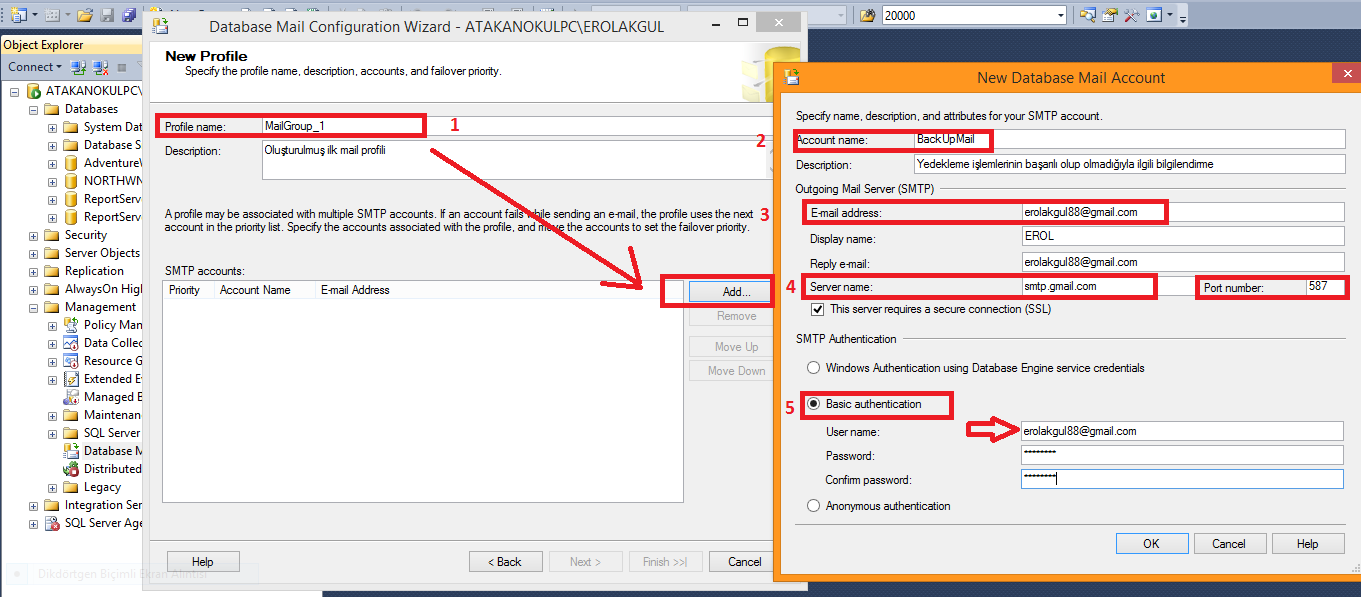 Açılan pencerede ilk olarak bir Profile Name oluşturuyoruz.İlk mail profili olduğundan “MailGroup_1” ismini veriyorum.Da sonra ince ok ile gösterildiği gibi “ADD” diyerek yeni bir Mail Account u oluşturuyoruz. 2 de Account Name i o mail in ne ile ilgili olduğunu belirten bir isim veriyorum. 3 te mail in gönderileceği hesabı veriyorum. 4 te, verdiğim hesaba göre protokol için bir server name giriyorum,burda gmail hesabına mail göndereceğim için gmail’in smtp server name ve port numaralarını gösterilmiş alanlara giriyorum. 5 te ise Protocol ün yetkilendirilmesinin nasıl yapılacağı ile ilgili tanımları giriyorum ve mail gönderilecek olan hesabım ve onun şifresini doğrulatarak girip bir diğer sihirli kelime olan “OK” diyorum.