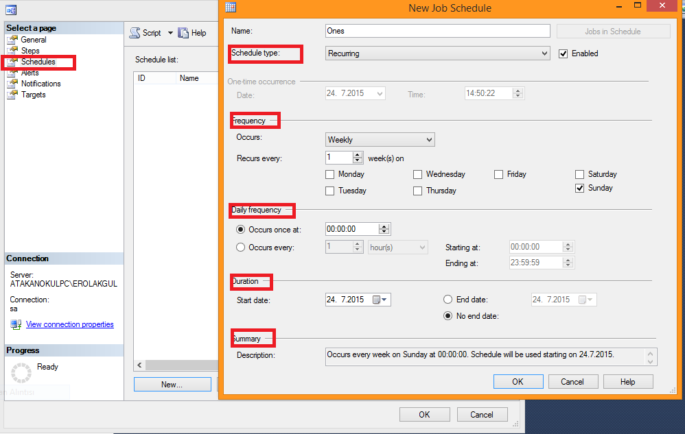 # Schedules sekmesinde new diyip backup ın alınma zamanlarını yada bir kere alınacaksa alınma zamanını belirtiyoruz.Schedules Type kısmında 4 seçenek mevcut “Sql Server Agent ları başlatıldığında”,”CPU boş olduğu zamanlarda”,”Tekrarlanmasını istediğinizde” ve “Sadece birkez” seçenekleri mevcuttur,burada istediğiniz herhangi bir özelliği seçebilirsiniz oluşturacağınız schedule e göre.İlk 2 seçenekte alt kısımlarda herhangi bir değişiklik yapmanıza gerek yok,”Recuring” seçiminde sizden “sıklık” ayarları yapmanızı isteyecek ve “Occurs” kısmında “Günlük,haftalık,aylık” ayar yaparsınız.”Recurs Every” seçeneğinde kaç haftada ayda yada günde devam etmesi gerektiğini söylüyorsunuz.”Daily Frequnce” kısmında günlük başlangıç ve bitiş saatlerini giriyorsunuz.”Duration” kısmında başlangıç günü ve Bitiş Gününü belirtiyorsunuz.Summary kısmında ise ayarlarınız gözükmektedir.
