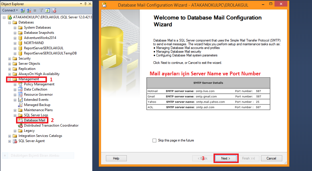 2 nolu sekmemize sağ tıklayıp Mail Configuration Wizard ını başlatıyoruz.Resmin üzerinde verilen Server Name ve Port Number ları daha sonra kullanmak üzere şimdilik bırakıyoruz.Next dedikten sonra ;