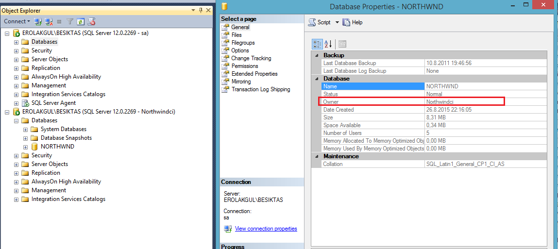 Kullanıcıyı önce düşürdük,sonra “change db owner” store procedure ü yardımıyla owner olarak tekrar atadık,daha önce yetki verilmiş bir kullanıcıya aynı zamanda owner olma özelliğini atayamayız.Query çalıştıktan sonra yenilediğimizde sadece sistem veritabanları ve owner özelliğini verdiğimiz veritabanını görebilmektedir.