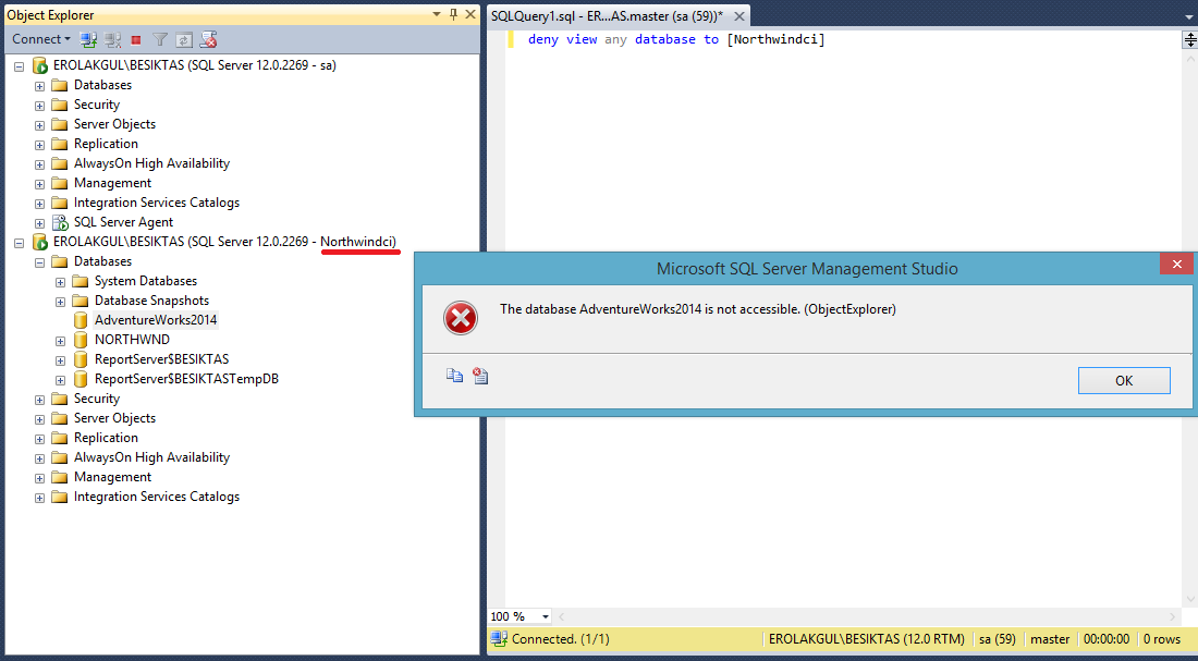 Resimde de görüldüğü gibi AdventureWorks departmanındaki veritabanını açamıyor,açamıyorsa orda görünmesininde bir anlamı olmadığını düşünmüşler ve bunu göstermemek için şöyle bir yol izliyoruz.Public rolü ile gelen “view any database” yetkisi kaldırılarak yetkili olduğu veritabanının gösterimi sağlanmaktadır.