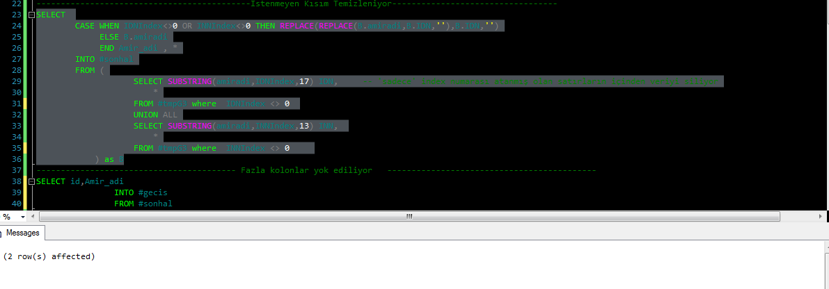 İç kısımda Substring fonksiyonunu kullanarak arama yaptığımız kolonun içindeki verilerde IDNIndex in sıfır olmadığı yerde IDNIndex in numarası başlangıç indisi kabul edilerek 3.parametrede belirtilen uzunluğu kadar,yine INNIndex in sıfır olmadığı yerde de INNIndex in numarası başlangıç indisi olacak şekilde 3.parametrede belirtilen uzunluk kadar kesip Union All ile birleştirip,dış kısımda da Allias ına girilmiş olan o değerlerin yerlerini boşluk ile değiştirerek temizlemiş oluyoruz.
