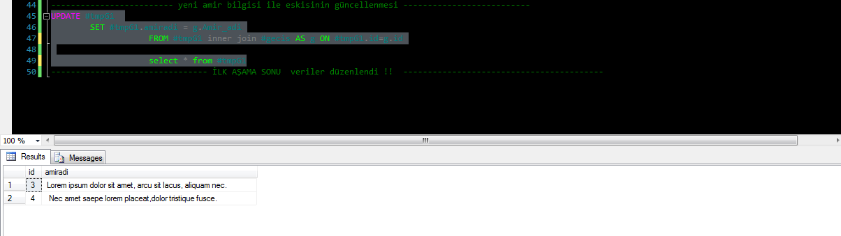 Yukarıda ki resimde de bu verileri attığımız #sonhal isimli temp tablo içeriği görülmektedir.Normal tablomuzda bu kadar kolon yoktu ve dolayısıyla yine id ve amiradi kolonları olacak şekilde #gecis temp tablomuzu dolduruyoruz ;