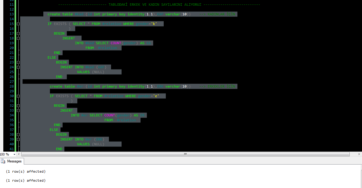 Bu kısımda erkek ve kadınlar için birer temp tablo daha açıp eğer istediğimiz filtre de veri varsa sayısını aldırıp yoksa “NULL” yazdırıyoruz.
