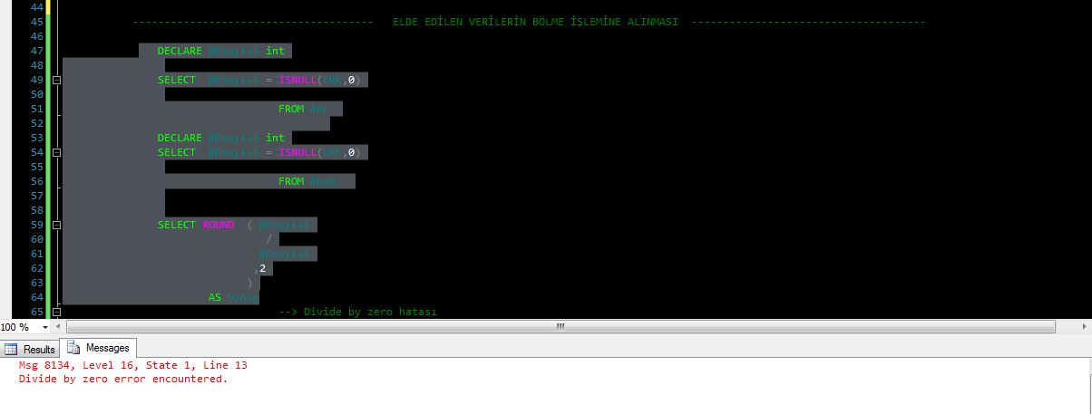 NULLIF () fonksiyonu içine girilen parametreler birbirine eşitse “NULL” değer döndürür. Son olarak ISNULL(KAF,0) bize “sıfır” değerini döndürdüğünden ve de 2.parametre olarak 0’ı kontrol ettirdiğimizden değer olarak “NULL” döndürerek kod bloğunun çalışmasına devam etmesini sağlamıştır.