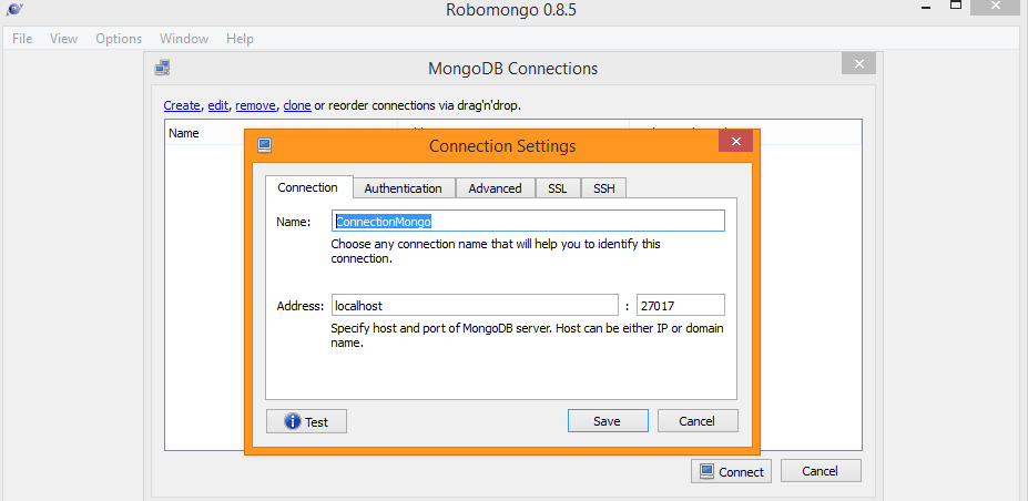 Bu kısımda göreceğiniz üzere connection ismi belirtiyoruz (ConnectionMongo gibi),hemen altında da mongo server ının pc mizde dinlediği ve yayın yapacağı port numarası olan 27017 yi görüyoruz.