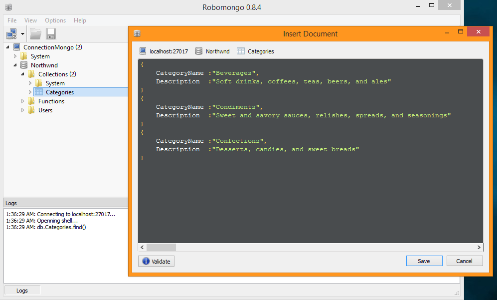 Collection ı oluşturduktan sonra da sağ tıklayıp “insert document” diyoruz ve json data formatında verilerimizi giriyoruz ;
