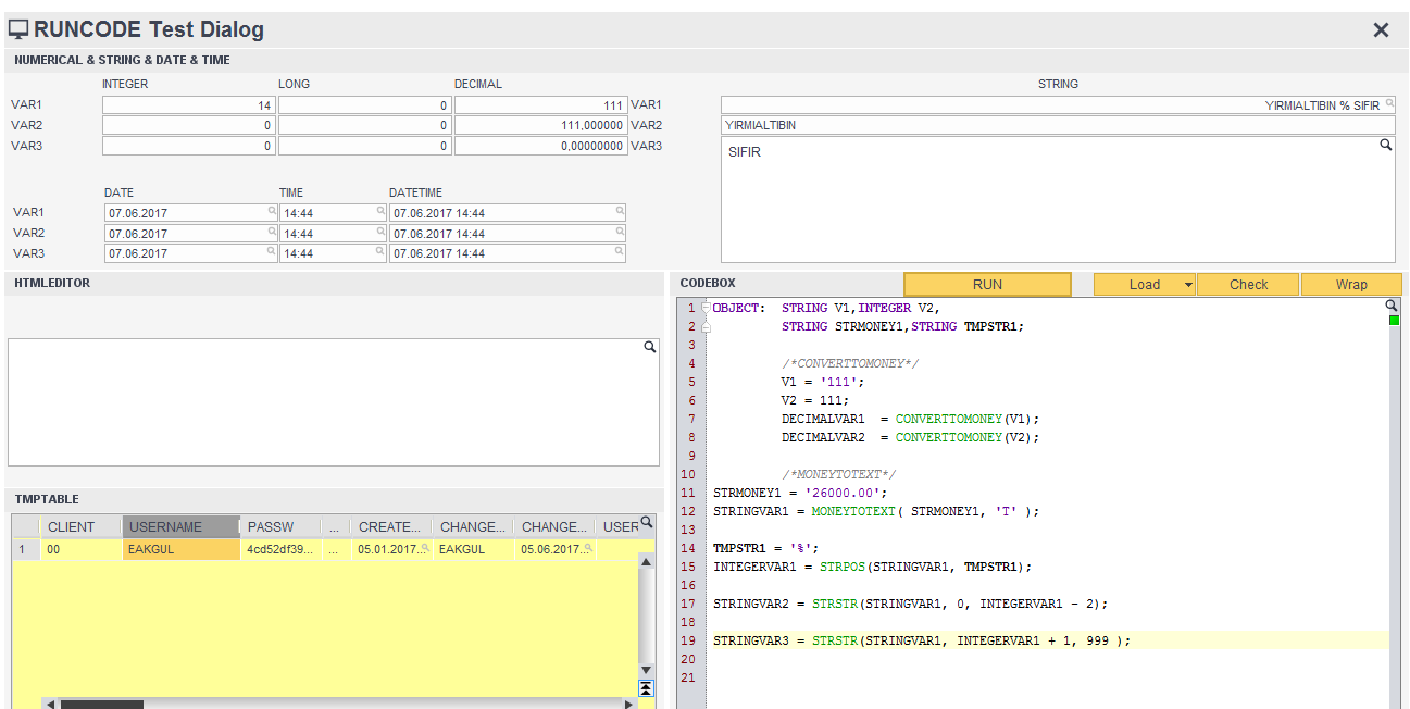 STRMONEY1 değişkeni ile bir değer verilen bu fonksiyonun sonucu ‘T’ yani türkçe olacak şekilde çıktı üretir. Bu sonuç her zaman için tl olan kısım ile kuruş olan kısım arasında % işaretini üretir. Örneğin 35600.30 için OTUZBEŞBİNALTIYÜZ % OTUZ veya 25000.00 için YİRMİBEŞBİN % SIFIR gibi.