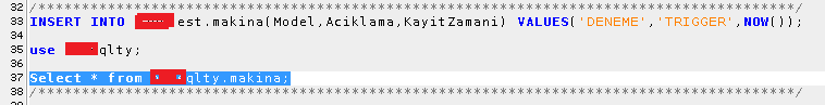 Son olarak test teki makina tablosuna bir veri insert ediyoruz ve use qlty ile veritabanını değiştirip qlty deki makina tablosuna o verinin eklendiğini de görüyoruz.