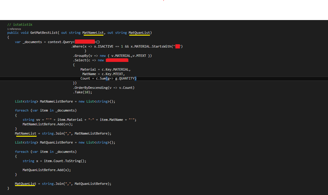 Db tablomuzda malzemeye göre gruplama yaparak verileri çoktan aza doğru olan 10 veriyi alıyoruz. Daha sonra buradaki verileri string tipinde list koleksiyonuna alıyoruz ve her veriyi join fonksiyonu ile virgülle ayırıyoruz.