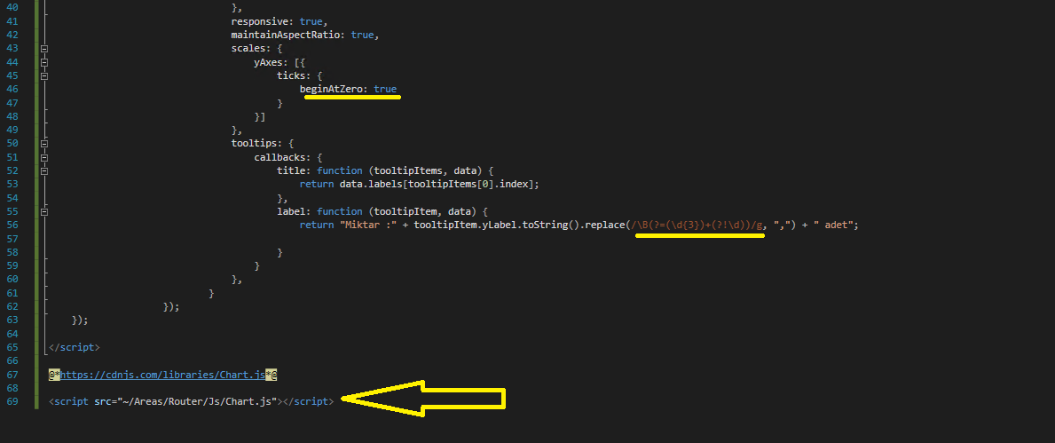 Sayfanın layout’una https://cdnjs.cloudflare.com/ajax/libs/Chart.js/2.2.2/Chart.js linkini script içerisinde vererek başlayalım. Sayfayı yüklerken partial larda kullandığımız fonksiyonları tanıması için bu gerekli.