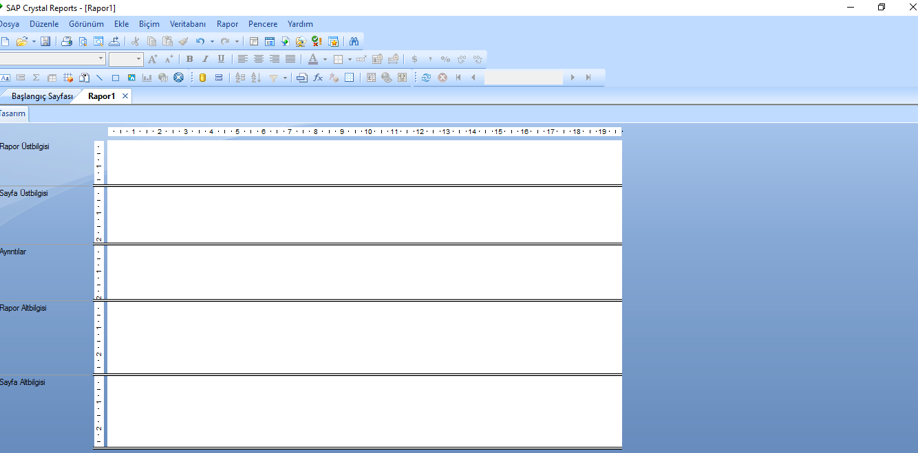 Açılan ilk sayfada sadece tasarım sekmesi (sol üstte) görülmektedir. Onun dışında bir rapor ekranında hangi bölümler olduğuna dair kısımlar mevcuttur. Bunlar ;
