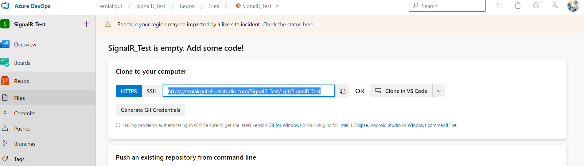 Oluştur ve gönder dedikten sonra projemiz azure repos’a gönderilmiş oldu.