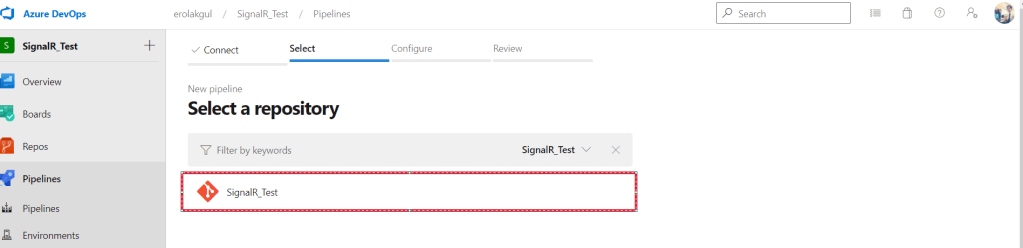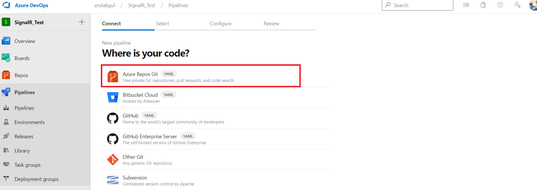 Sonraki ekranda, repomuzun yerini seçiyoruz, burada ben demoyu azure’da yapacağım için azure repos’u seçiyorum.