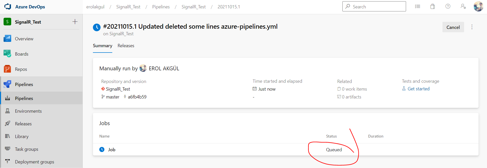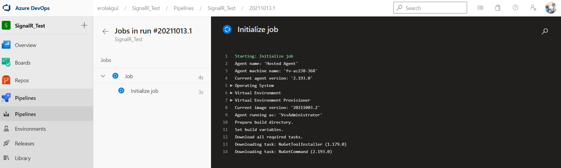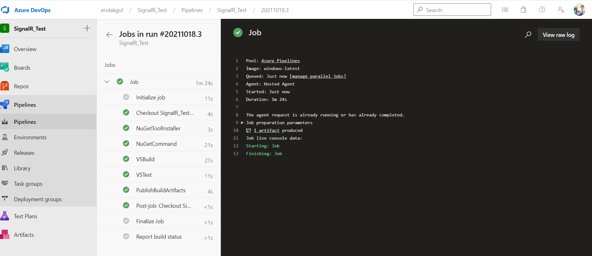 Kaydetme sonrası başlayan job pipeline’ının üzerine tıkladığımızda detayını da görmüş oluruz