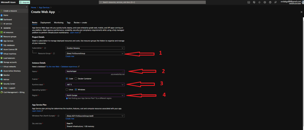 Azure portal’da bir app servis oluşturuyoruz şimdi, bunun için aşağıdaki adımları (4,5) izleyebiliriz