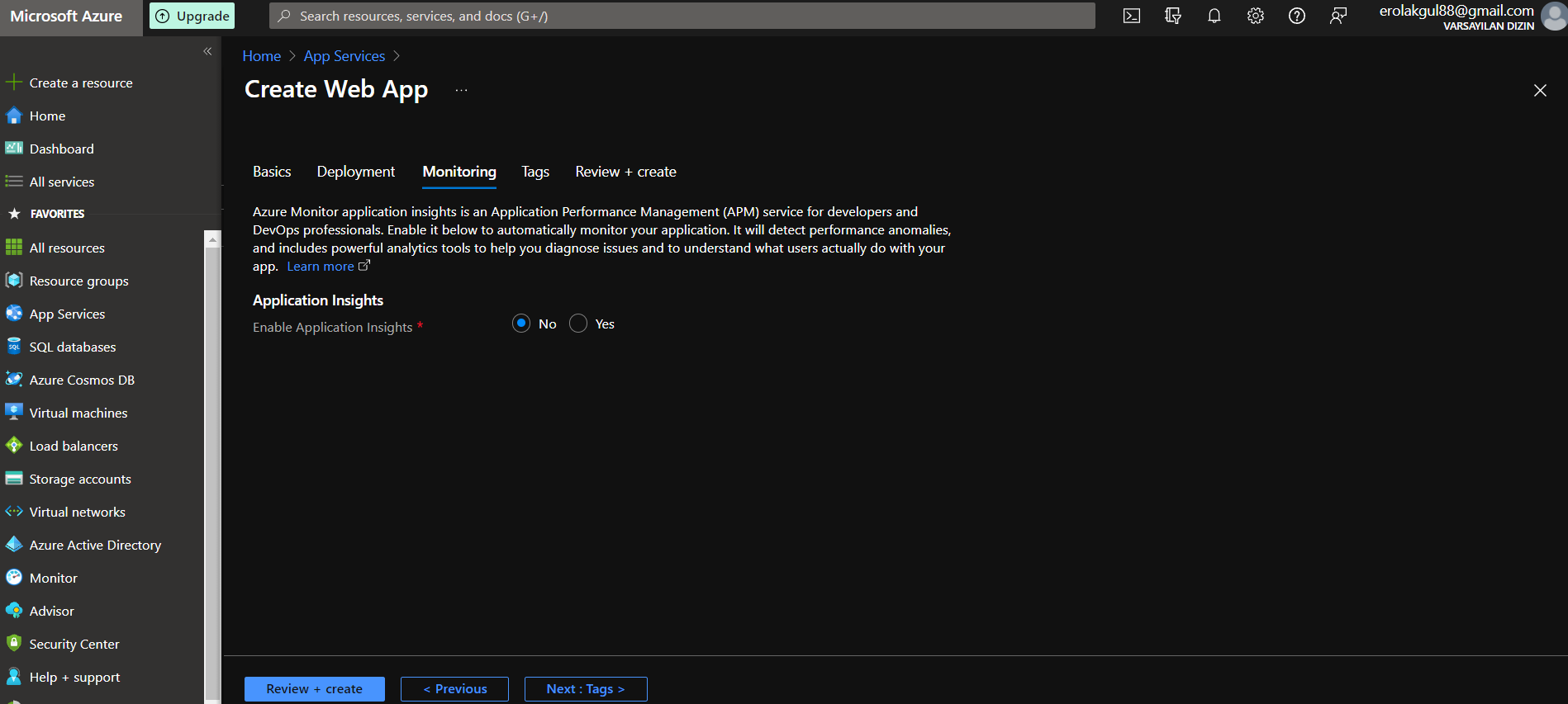 uygulama performans yönetim hizmetini şuan için istemediğim için bunu da hayır deyip devam ediyorum;
