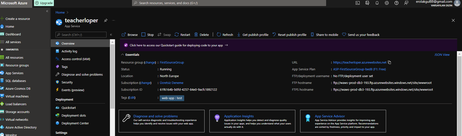 App service ismine teacherloper ismini vermiştim, detayına girip baktığımda yayın yapacağım site ile dahil tüm bilgileri görüyorum;