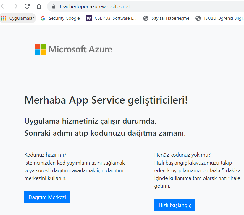 https://teacherloper.azurewebsites.net/ linkimde henüz bir uygulama yoktu, azure devops ta bu ci/cd sürecini tasarladık ve visual studio üzerinden herhangi bir değişiklik yapacağım, çünkü süreci başlatmam için değişiklikleri göndermem gerekiyor git üzerinden. Bu işlem gerçekleşince de doğal olarak azure portal da açtığım siteye bu değişikliğin yansımasını bekleyeceğim.