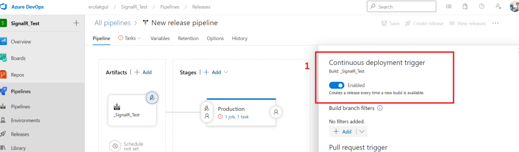 CD süreci için bir release pipeline oluşturacağız bu sefer de;