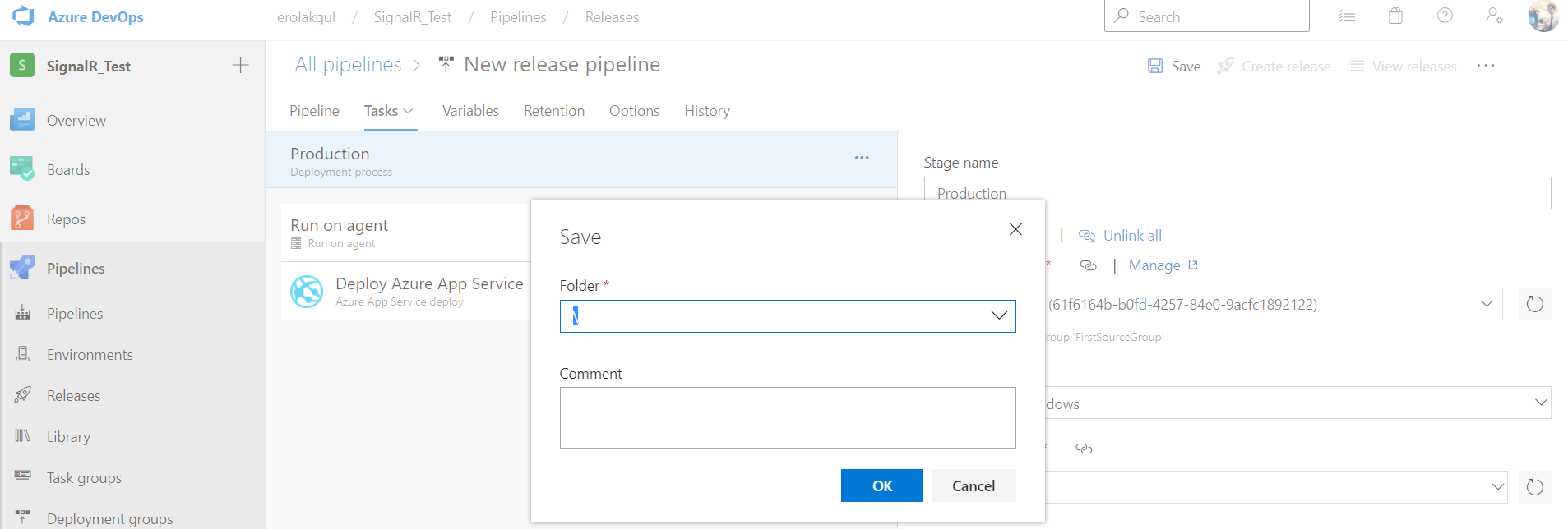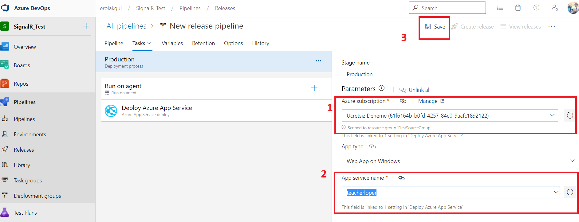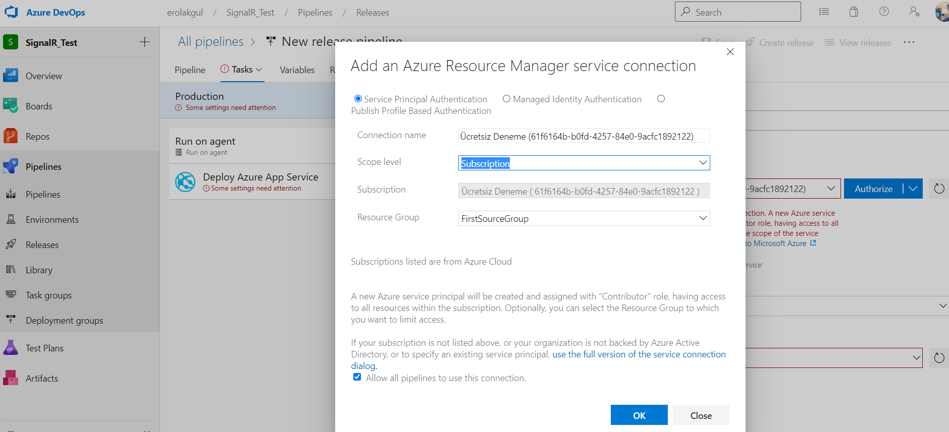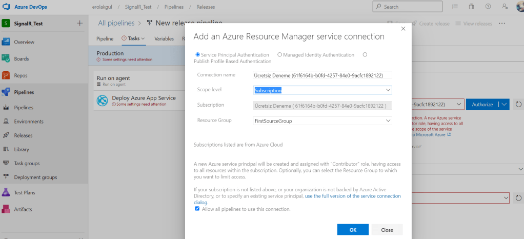 Bu adımdan sonra Task sekmesine gidip azure service imizi tanımlamamız gerekiyor, Azure subscription olarak ücretsiz olarak oluşturduğum hesabı seçiyorum, kaynak gurubu olarak da azure portal da tanımladığım firstsourcegroup u seçip ok diyorum, yetkiyi vermiş oldum.