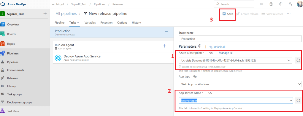 azure subscription altında, yetkiyide verdikten sonra app service lerden (ki sadece 1 tane var zaten) teacherloper simini verdiğim için ben onu seçiyorum. Son olarak da kaydet diyorum değişiklikleri.