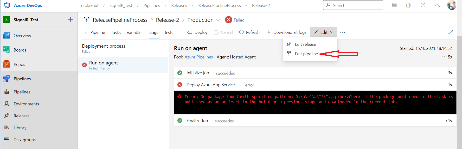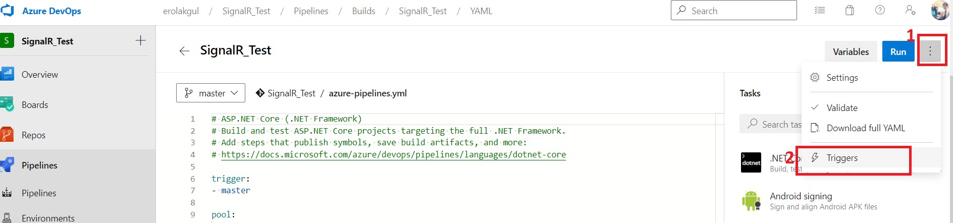 CI sürecini de otomatize etmek için; build pipeline a geri dönüyoruz, edit diyerek düzenleme ekranına geçiyoruz;