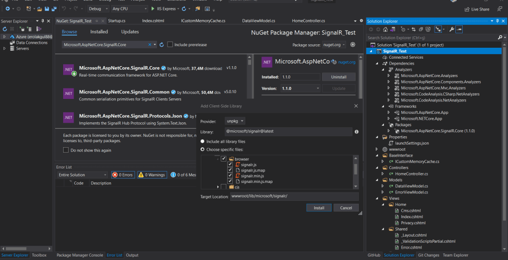 Proje üzerinde sağ click yapıp Add > Client-Side Library diyerek aşağıdaki gibi signal r paketlerini yüklüyoruz. (js paketini sadece)