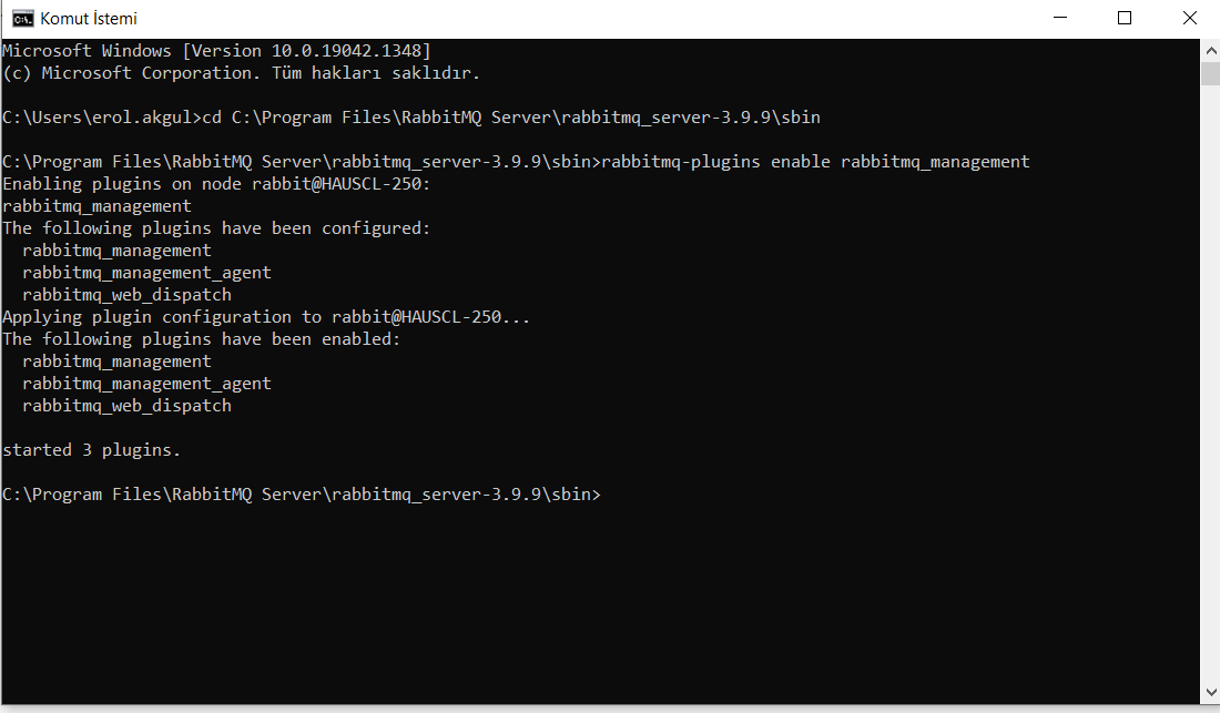 “C:\Program Files\RabbitMQ Server\rabbitmq_server-3.9.9\sbin” , path kopyalanır.