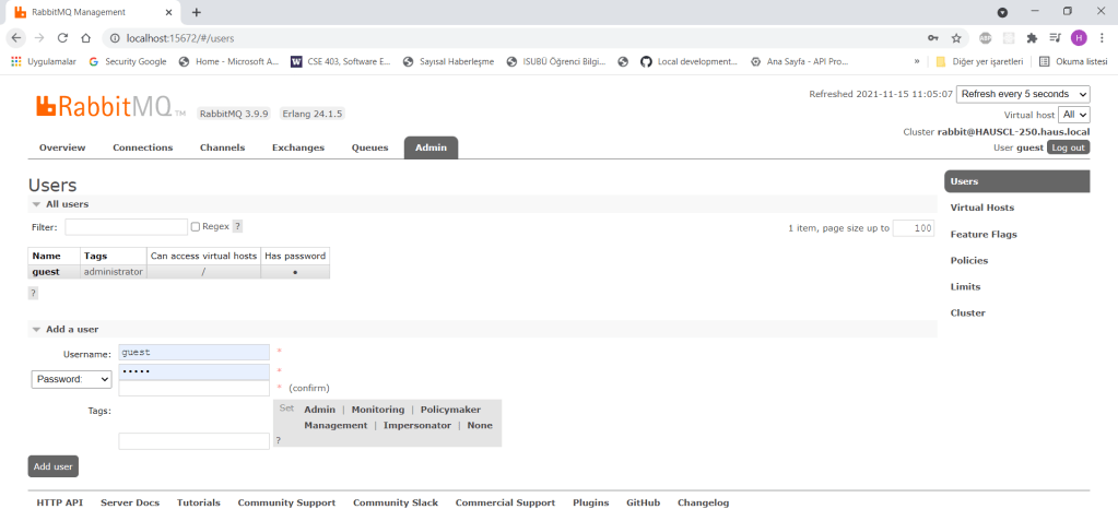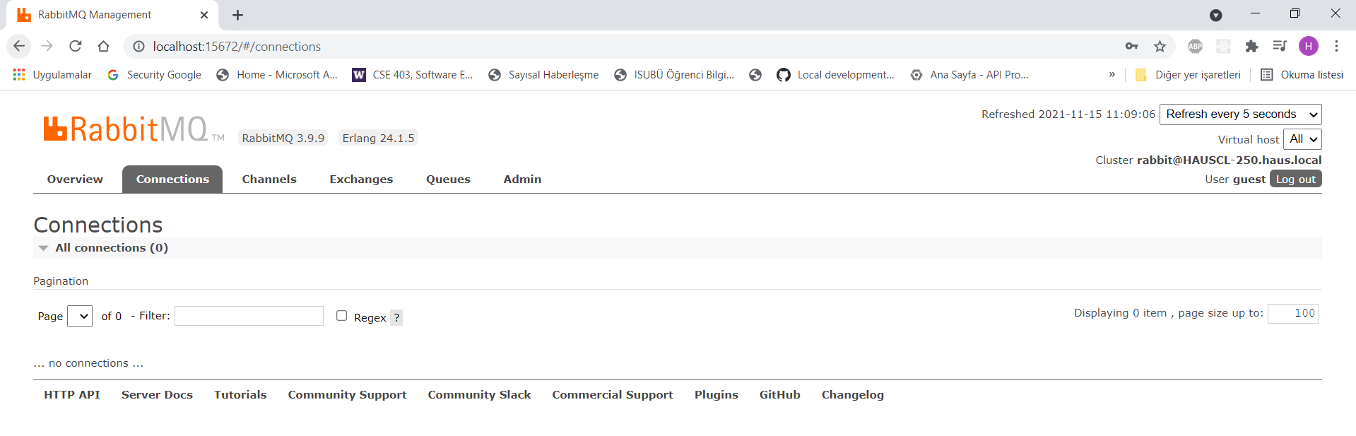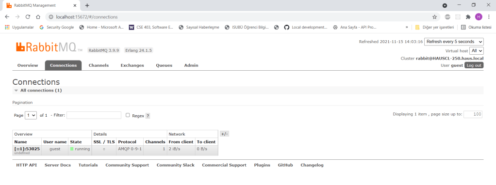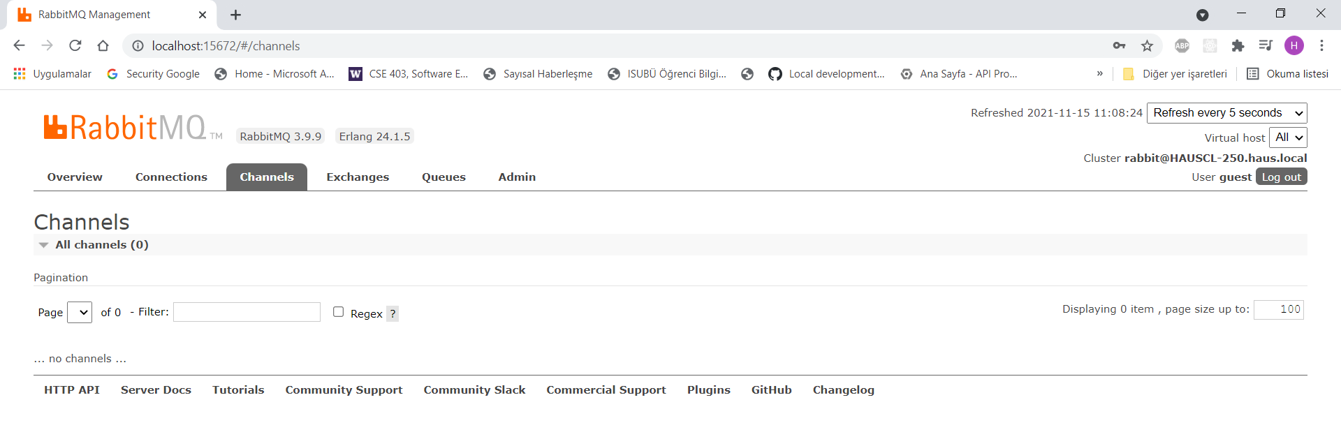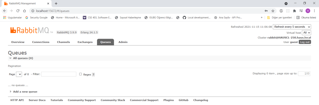 15672 portunda rabbit sunucusu çalışıyor görünüyor artık, guest guest ile login oluyoruz;