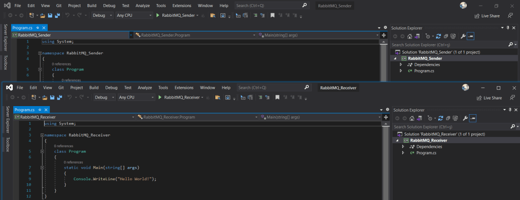 Sender ve Receiver olarak 2 tane console uygulamasını net 5.0 altyapısında açıyorum;