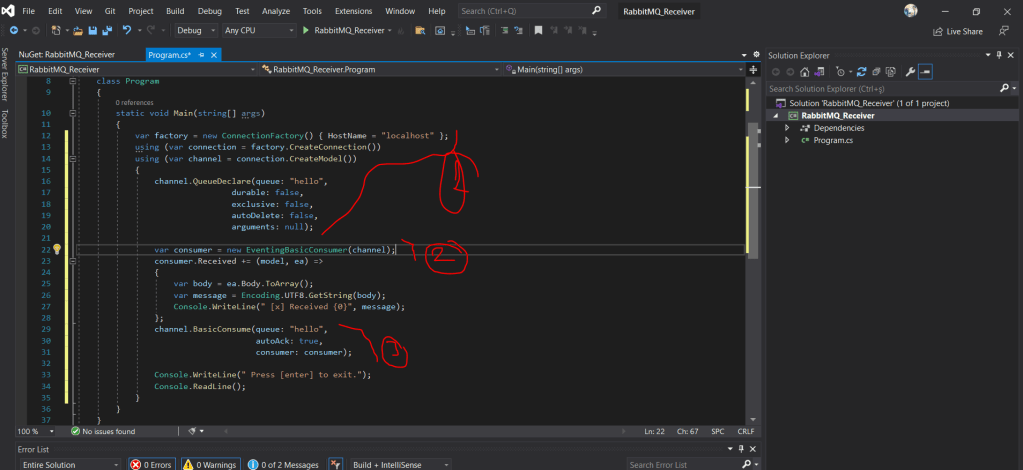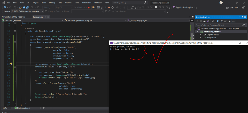 kurulumu Publisher ile aynıdır; bir bağlantı ve bir kanal açıyoruz ve tüketeceğimiz kuyruğu (“hello”) tanımlıoyurz.
