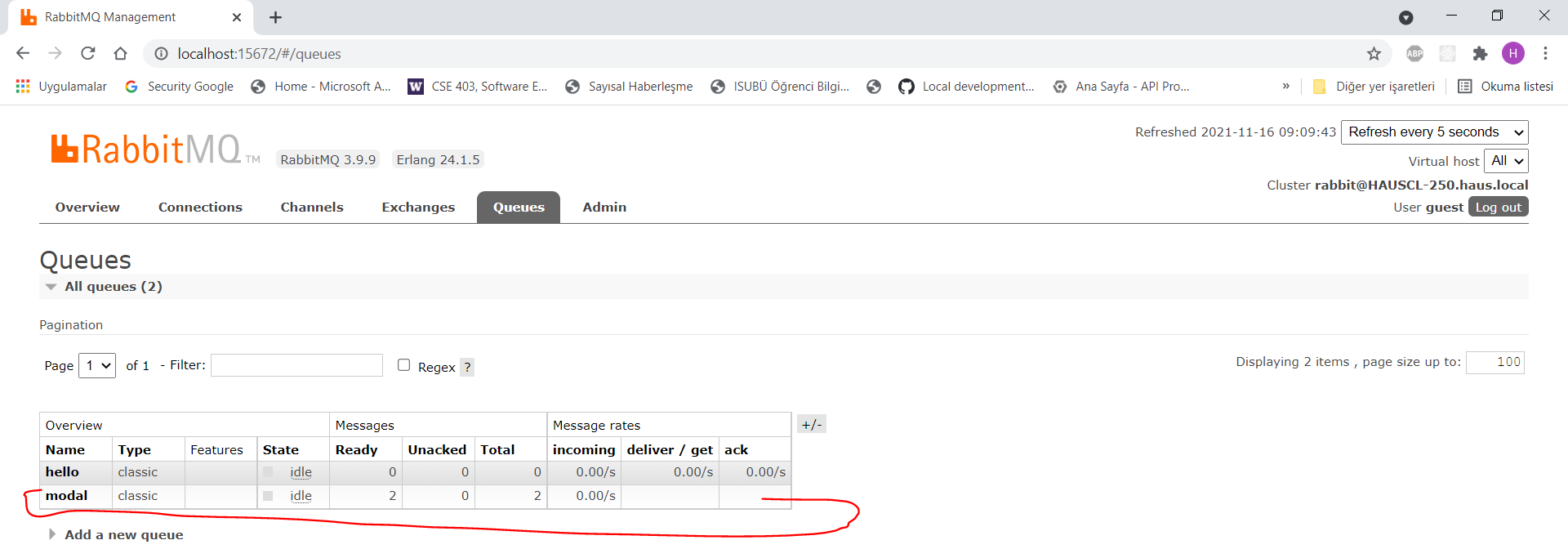 Sender uygulamamızı çalıştırdığımızda, rabbit mq sunucusunda modal kuyruğu ile datamın eklendiğini görüyorum, ready parametresinin 2 olmasının nedeni uygulamayı 2 kere başlatmamdan kaynaklı, aynı modal üzerinden 2 kere data göndermişim gibi görünüyor.