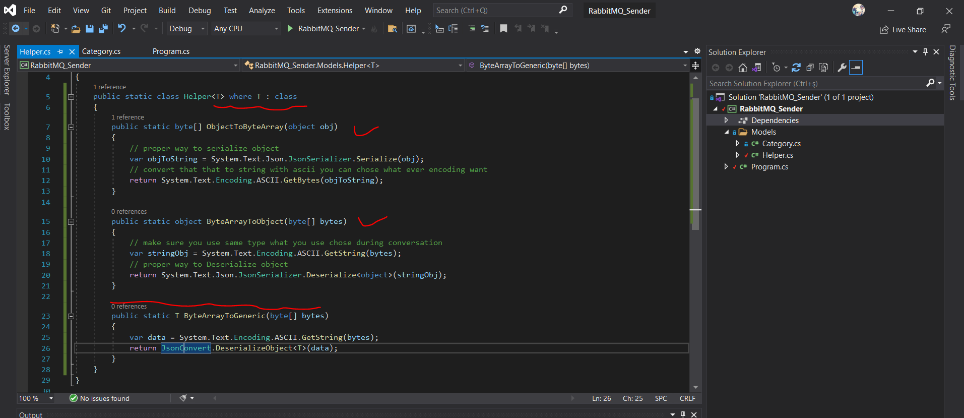 - Helper class üzerinde gelen objeyi byte a, byte gelen datayı da objeye çeviren method ile buradaki kodlara ek olarak helper ın generic olması için bir method daha yazıyoruz, gelen tip ne ise o tipte dönüş yaptırıyoruz;