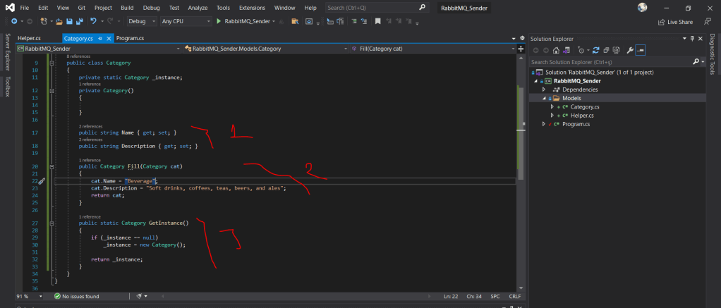 Category modelimde name ve description isimli 2 attribute üm var, bir tane Fill isimli method açıyorum ve static olarak dolduruyorum, son olarak da bir instance almak için fonksiyonumuzu yazıyoruz.