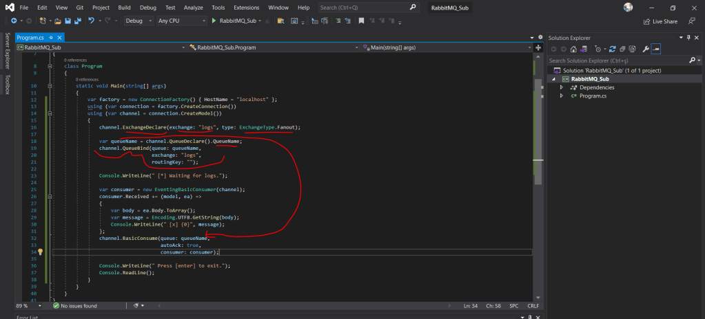 Alıcı taraftaki uygulama için de exhange tipini fanout olarak belirtip logs ismiyle takip ediyoruz. Burada bir önceki alıcı uygulamasına göre şöyle bir fark var,kuyruk ismini dinamik alıyoruz gibi bir durum var, bunu daha sonra basicconsume methodunda kullanacağız. QueueBind methodu ile exhange’in kuyruğumuza mesaj göndermesini söylüyoruz. Kuyruk ile exhange arasındaki ilişkiyi kuruyor.