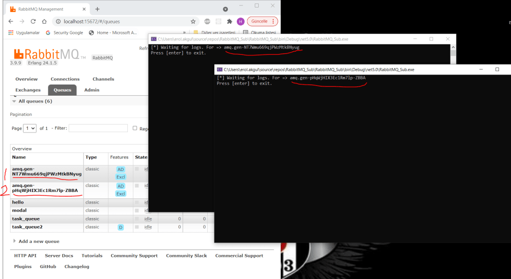 Son olarak rabbitmq yönetimi ile ilgili kodların cmd ekranında kullanımı ile ilgili olarak da bir örnek bırakalım, bind işlemlerini listelemek istediğimizde, çalışan 2 worker’ın datasını da görebiliyorum…