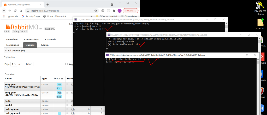 Şimdi pub uygulamamızı ve 2 tane sub uygulamamızı çalıştıracağız, ilk olarak yine sub ları çalıştırıyoruz;