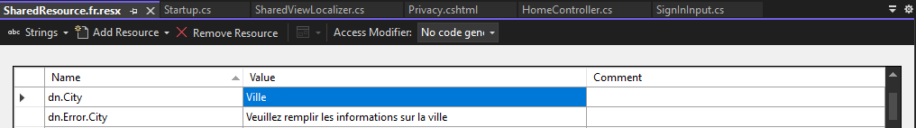 kaynak dosyalarımızda farklı bir isimlendirme ile kaydettiğimiz key leri direkt olarak çağırıp, dile göre karşılıklarını getirmesi için paylaştığımız ilk görseldeki gibi dn.City ile display name ini, dn.Error.City ile de boş bırakıldığında gösterilmesi gereken mesajın key karşılığını verdiğimizi varsayıyorum.