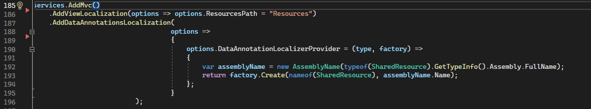 core 5 te; localization ayarını aşağıdaki gibi yapıyoruz. Resources klasörü altındaki kaynak dosyalarımı okumasını ve provider olarak da datanotation da kullandığım parametrelerin karşılıkları varsa getirmesini yoksa parametre olarak ne gönderiyorsam onu okuması gerektiğini belirtiyorum.