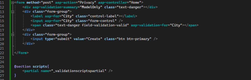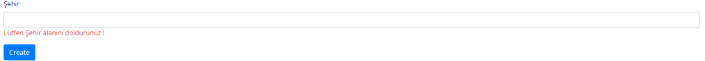 yapılandırma sonrası test için view tarafını da şu şekilde değiştiriyoruz, asp-validation-for City diyerek, Class ımızın City property sine ait validation ı kontrol etmesini istemiş oluruz.