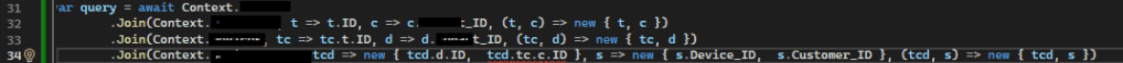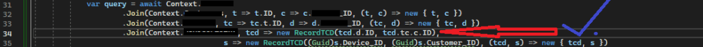 Birden çok entity nin join lenmesi aşamasında bir entity nin birden fazla match alanı olabilir. Bu aşamada da compile esnasında Compiler Error CS0833 hatası yani An anonymous type cannot have multiple properties with the same name. hatası alınır. Bu eşleştirme aşamasında dışarıdan alınan property isimleri bu örnekte ID – ID olarak gelmekte, kendi tablomuzda ise FK dan dolayı isim farklılaştığı için bu kısımda sorun olmamaktadır.