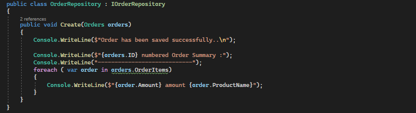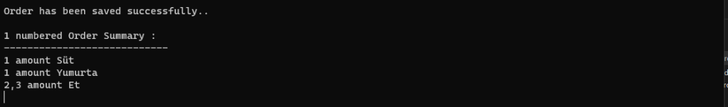 Console.WriteLine($"Order has been saved successfully..\n");