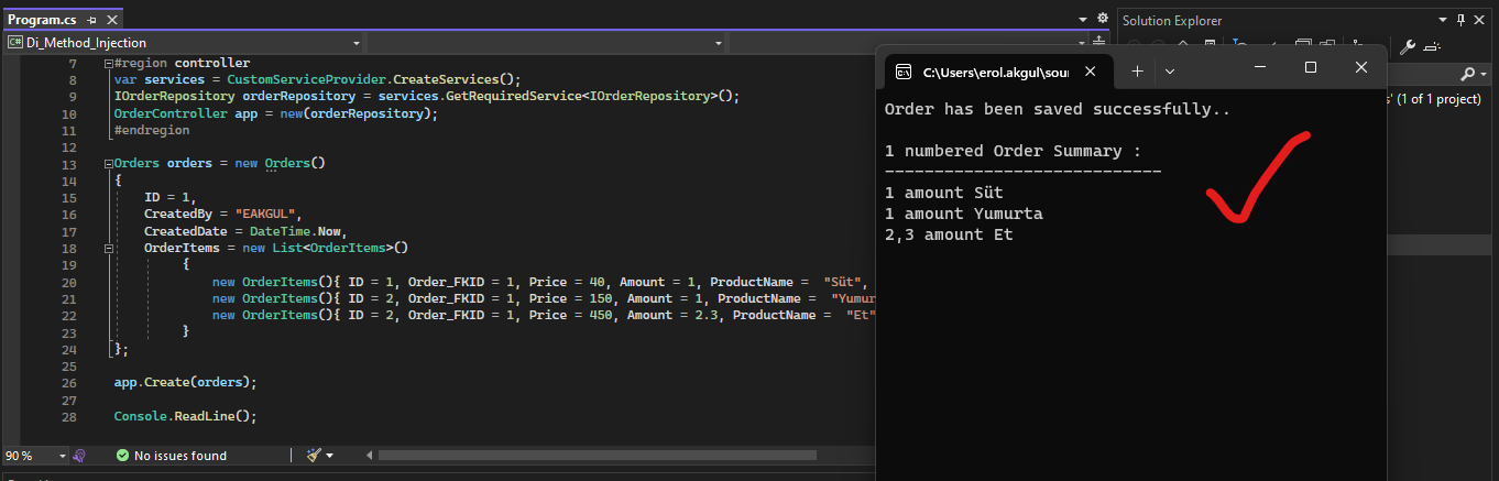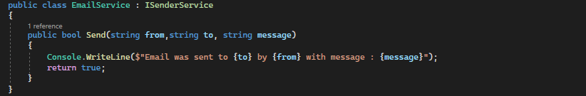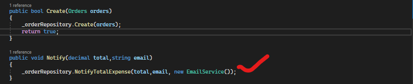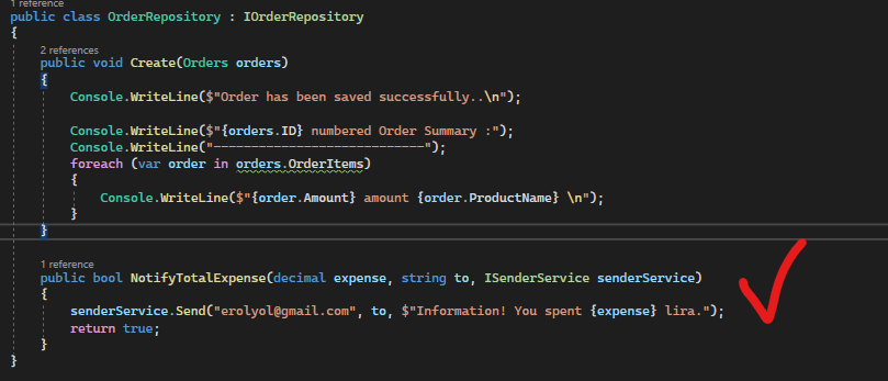 C-) OrderController altındaki Notify isimli methotta(asp de action gibi düşünebiliriz), bildirim gönderilmesi için NotifyTotalExpense isimli repo methodu çağırılıyor. İhtiyacı olan ISenderService nesnesinin EmailService ile gönderimi sonrasında çalışır hale geliyor. Constructor Injection yöntemindeki “servisi kayıt etme” (dependency injection service registration) işlemi methoda o nesnenin gönderimi ile sağlanmış oluyor.
