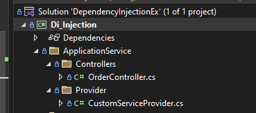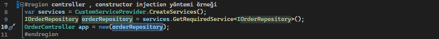 öncelikle serviceprovider a erişiyoruz, dönen nesnelerden IOrder ı istiyorum, sonra da onu OrderController ın yapıcı methoduna gönderiyorum.Böylece daha henüz OrderController ın oluşturulma aşamasında , ordercontroller altındaki tüm methodlarda IOrder nesnesini kullanabilir hale geliyorum.