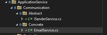 AppService altında Communication isimli bir klasör daha açıp, ISender isimli bir servis ile, onu inherit eden email servisi ekliyorum.