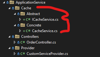 Application Service altında Cache isimli bir klasör açıp interface ve onu kullanan class ı oluşturuyorum.