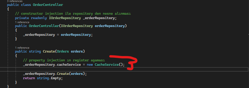 eğer etmezsek de ICacheService isimli arayüzü kullanamaz hale gelir. Dolayısıyla method içerisinde bu arayüzün bağımlılığı dışarıdan gelecek olan property ile değiştirilmiş oldu.